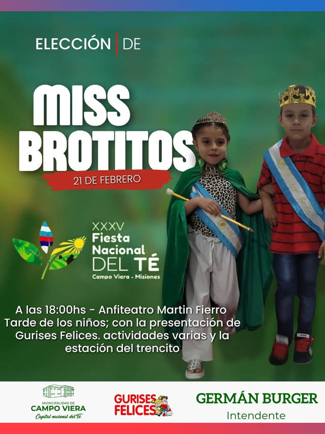 AGENCIA MISIONES.UNO | La Municipalidad de Campo Viera realizará este sábado 21 de febrero la Elección Miss Brotitos en el marco de la Tarde de los Niños, con propuestas recreativas y actividades para toda la familia.