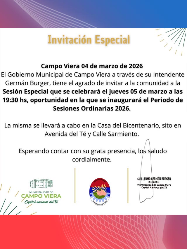 AGENCIA MISIONES.UNO | El intendente Germán Burger invitó a la comunidad de Campo Viera a participar del Acto de Apertura del Período de Sesiones Ordinarias 2026 del Honorable Concejo Deliberante, que se llevará a cabo el jueves 5 de marzo a las 19:30 en la Casa del Bicentenario.