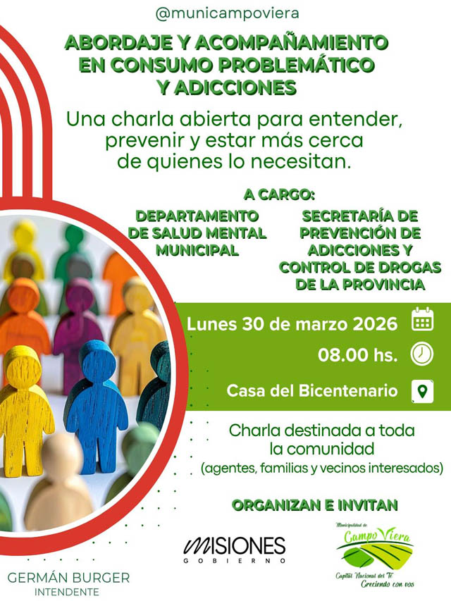 AGENCIA MISIONES.UNO | La Municipalidad de Campo Viera invita a la comunidad a participar de una charla abierta orientada a brindar herramientas, acompañamiento y comprensión frente a situaciones de consumo problemático y adicciones. La actividad se desarrollará este lunes 30 de marzo a las 08:00 horas en la Casa del Bicentenario.