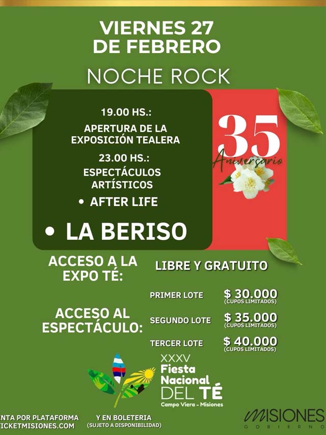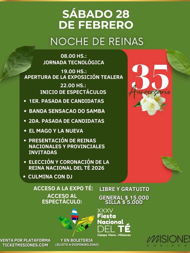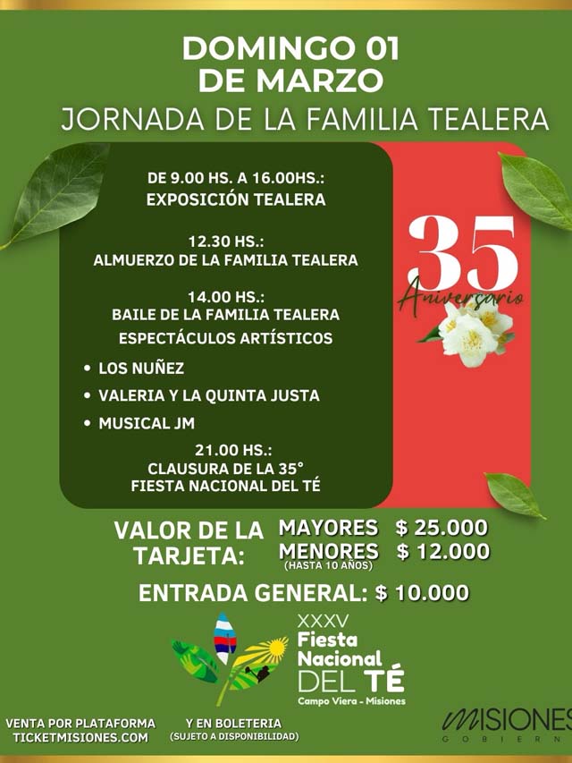 AGENCIA MISIONES.UNO | Desde el 26 de febrero y hasta el 1 de marzo se desarrolla en Campo Viera la XXXV Fiesta Nacional del Té, un evento que celebra la producción tealera, la cultura y el turismo, convocando a visitantes de toda la región.